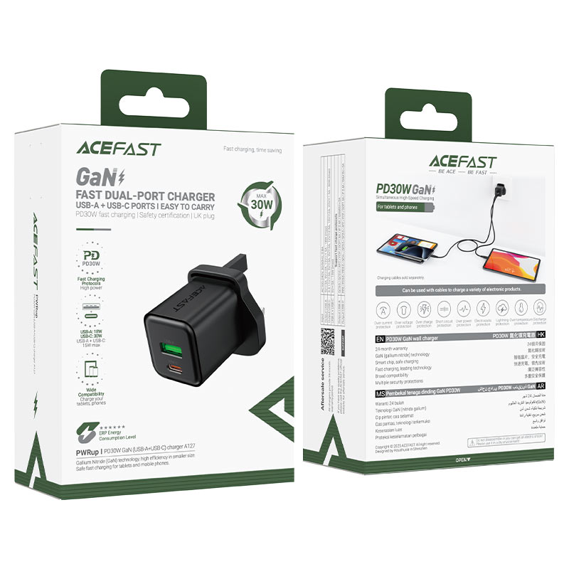 Fast Charge Wall Charger A127 PD30W GaN (1xUSB-A+1xUSB-C) UK